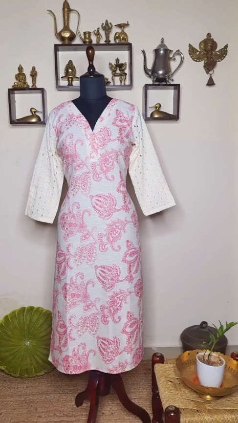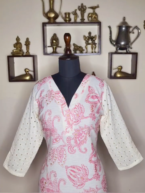 Half white printed cotton kurti with hakoba sleeves