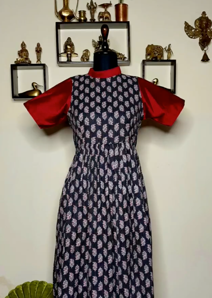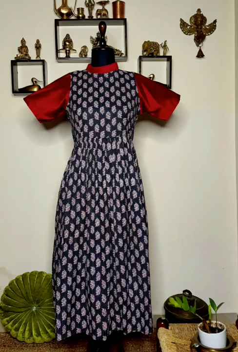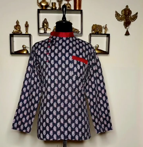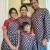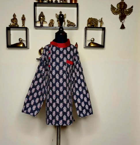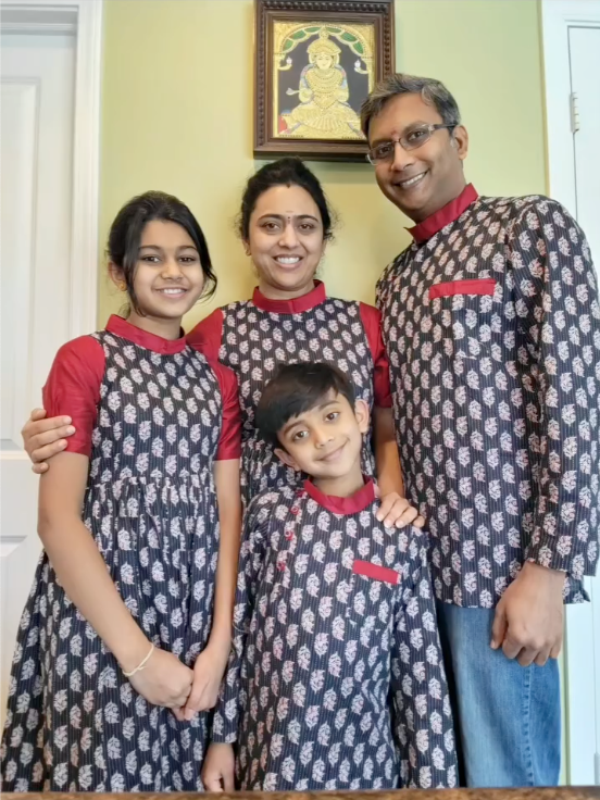 Family combo kantha fabric outfits embellished with contrast maroon raw silk fabric in the collar, sleeves, loops and in pockets