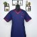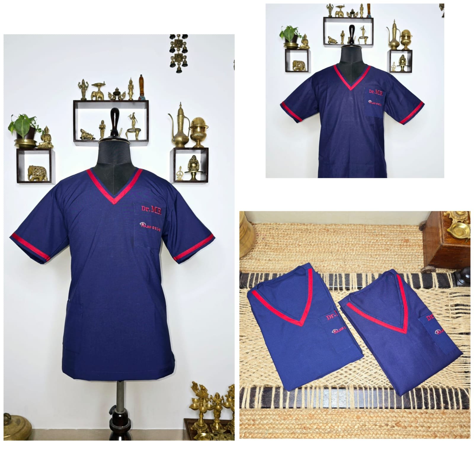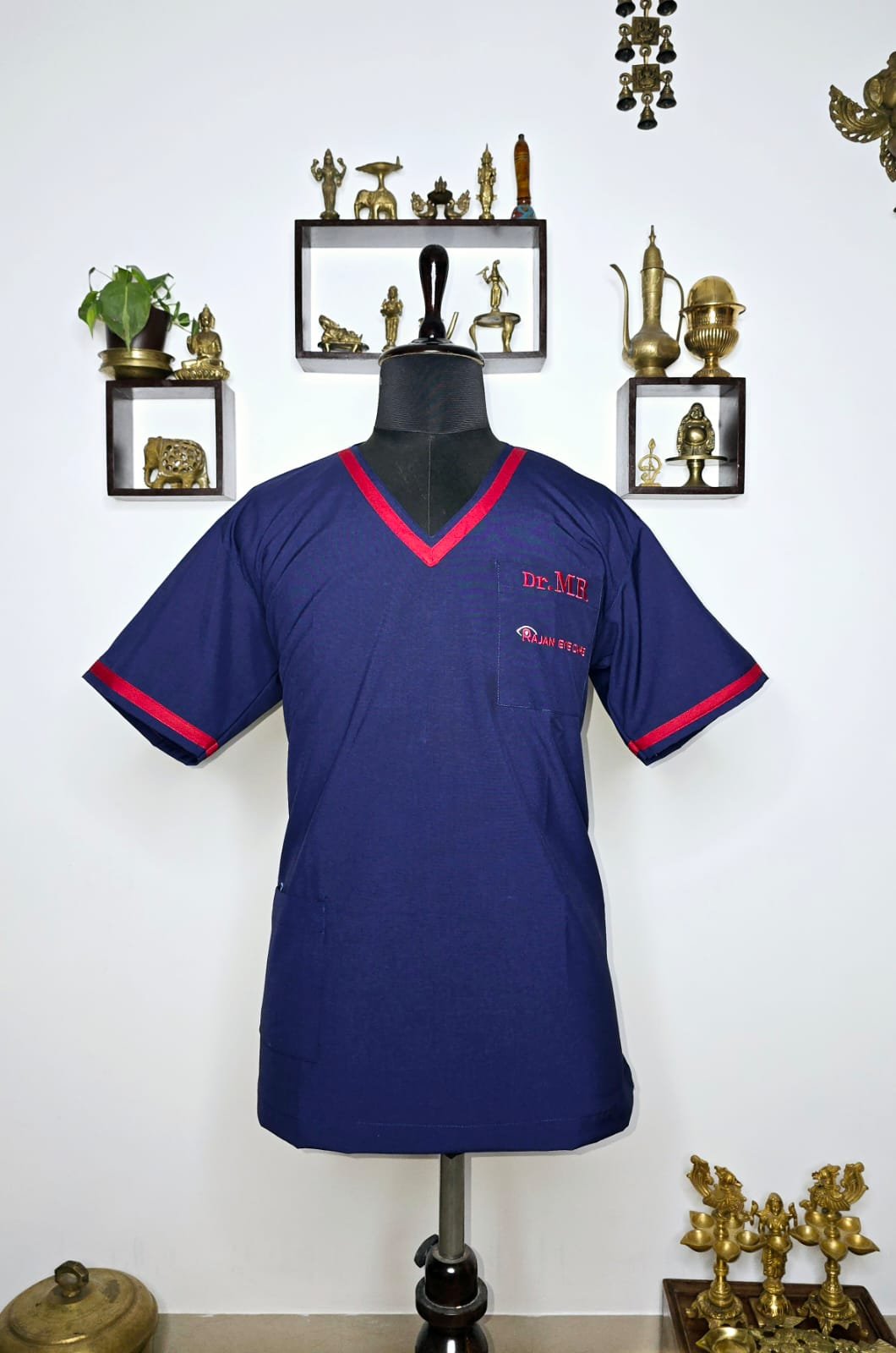 Navy blue scrub with red border in the neck line and sleeves. curated with their hospital logo and name.